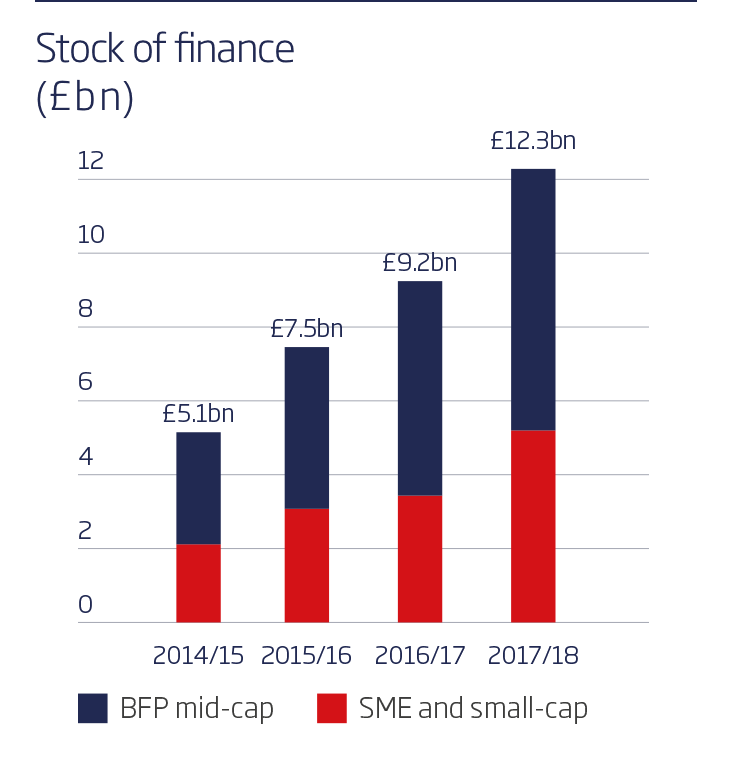 When the Bank was launched in November 2014, we were set a target of £10bn on this metric, which we were expected to achieve by 31 March 2019. We reached this important milestone midway through the 2017/18 financial year, 18 months ahead of schedule. As at the end of 2017, we had £12.3bn of stock of finance facilitated, an increase of 33% from £9.2bn the previous year. Of this, £5.2bn went towards SMEs and £7.1bn for mid-cap firms.